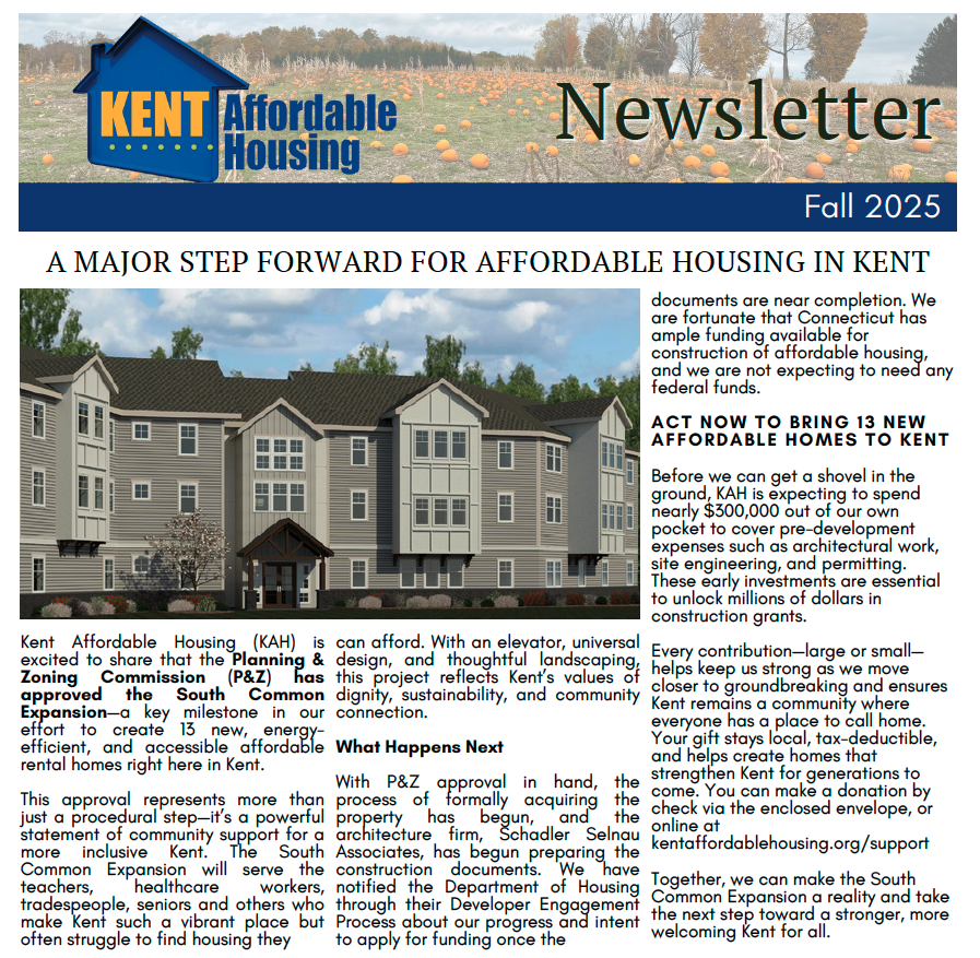 The Town of Kent Housing Plan for 2022-2027 was created in accordance with a new law, 8-30j, which requires all towns in Connecticut to create a housing plan every five years. Kent’s plan calls for at least 20 dedicated affordable housing units to be created in the next five years. Click on the image to the right to read the plan.